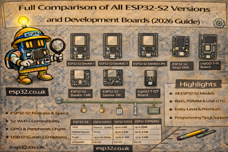 ESP32-S2 is the “USB + Wi-Fi” ESP32: single-core, Wi-Fi only (no Bluetooth), and designed for USB devices, low-cost IoT, and HMI-style projects where you want native USB without stepping up to ESP32-S3. But “ESP32-S2” can mean different things: This guide…