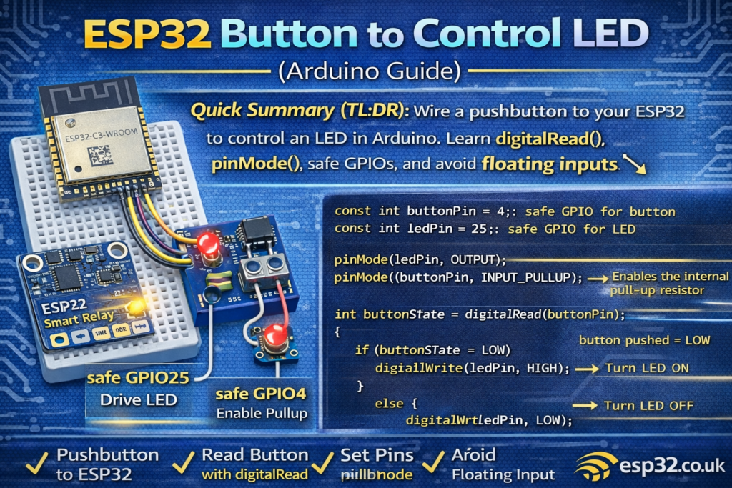 This beginner guide explains how to wire a pushbutton to an ESP32 and use it to control an LED. You’ll learn what digitalRead() returns, why pinMode() matters, and how to avoid the most common beginner issue: a floating input (random button presses).