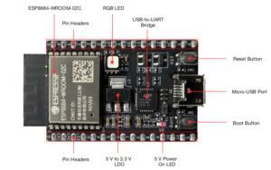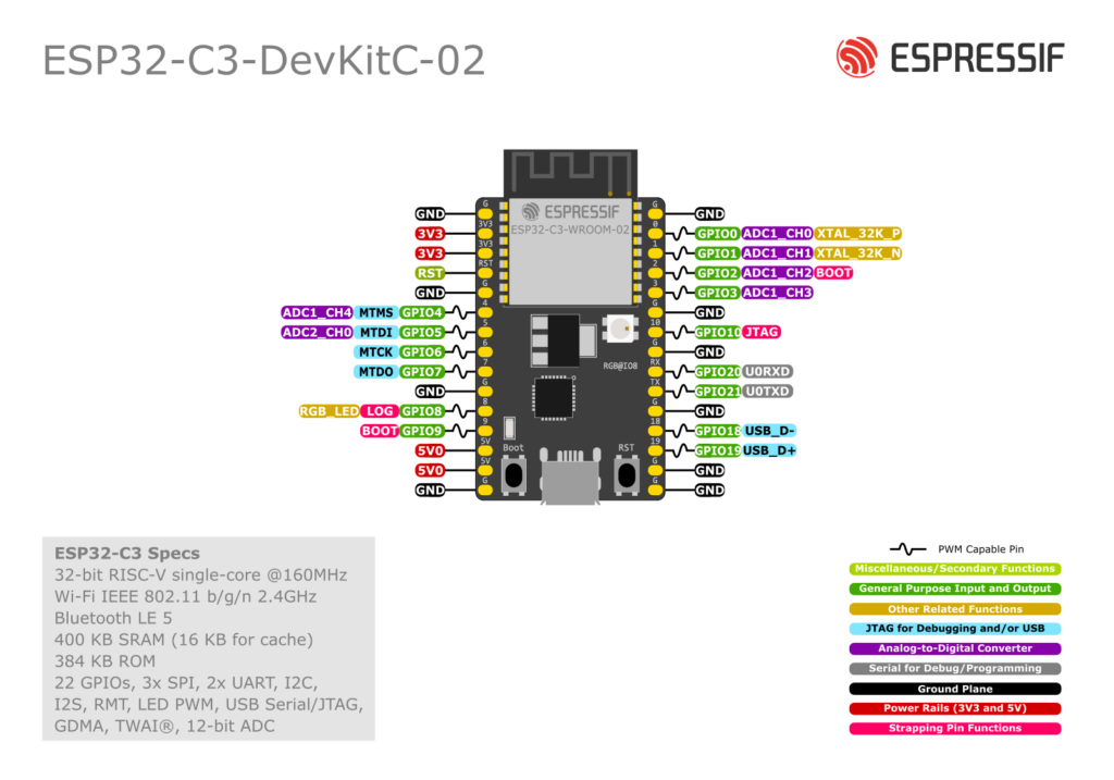 The ESP32-C3-DevKitC-02 is Espressif’s small RISC-V dev board based on the ESP32-C3-WROOM-02 module (4 MB flash, Wi-Fi + BLE). Almost all useful GPIOs are broken out on the two headers J1 and J3.