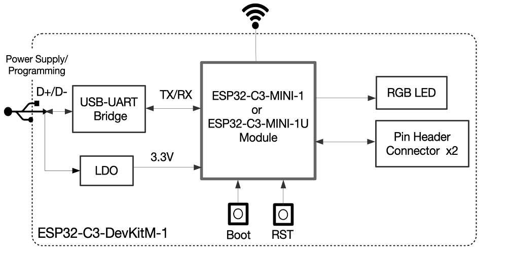 - MCU: ESP32-C3 (single-core 32-bit RISC-V up to 160 MHz)