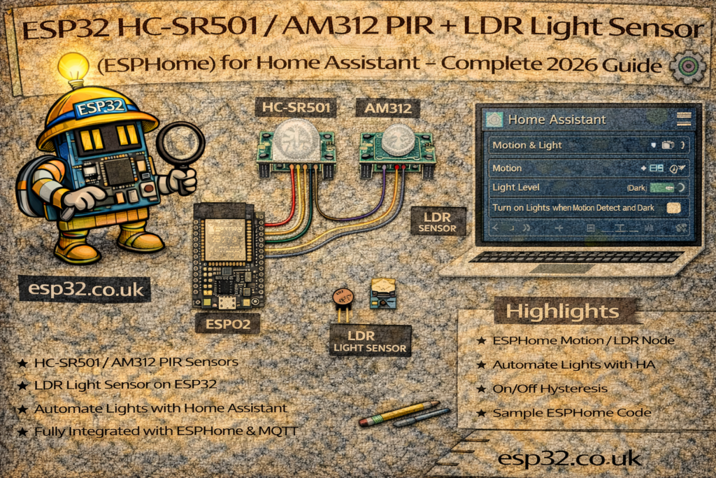This guide explains how to connect a PIR sensor + LDR to an ESP32 and integrate them into Home Assistant using both ESPHome and MQTT.
