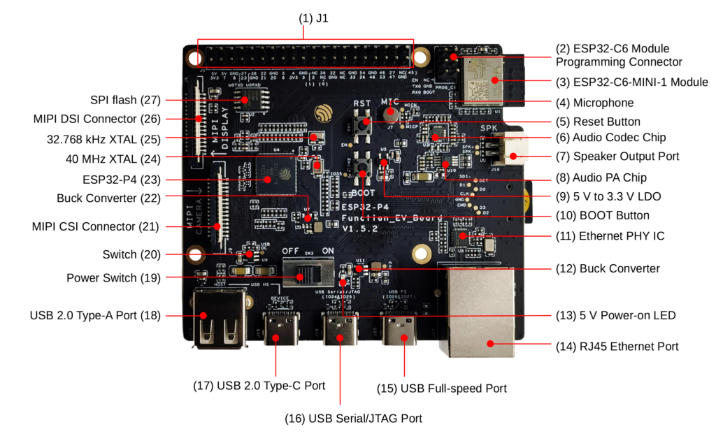 ESP32-P4-Function-EV-Board v1.5.2 – Pinout & GPIO Guide (J1 Header, USB, LCD, Camera, Ethernet)