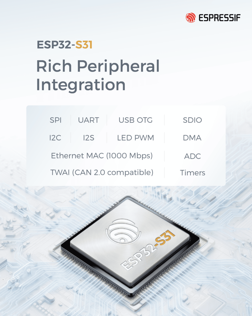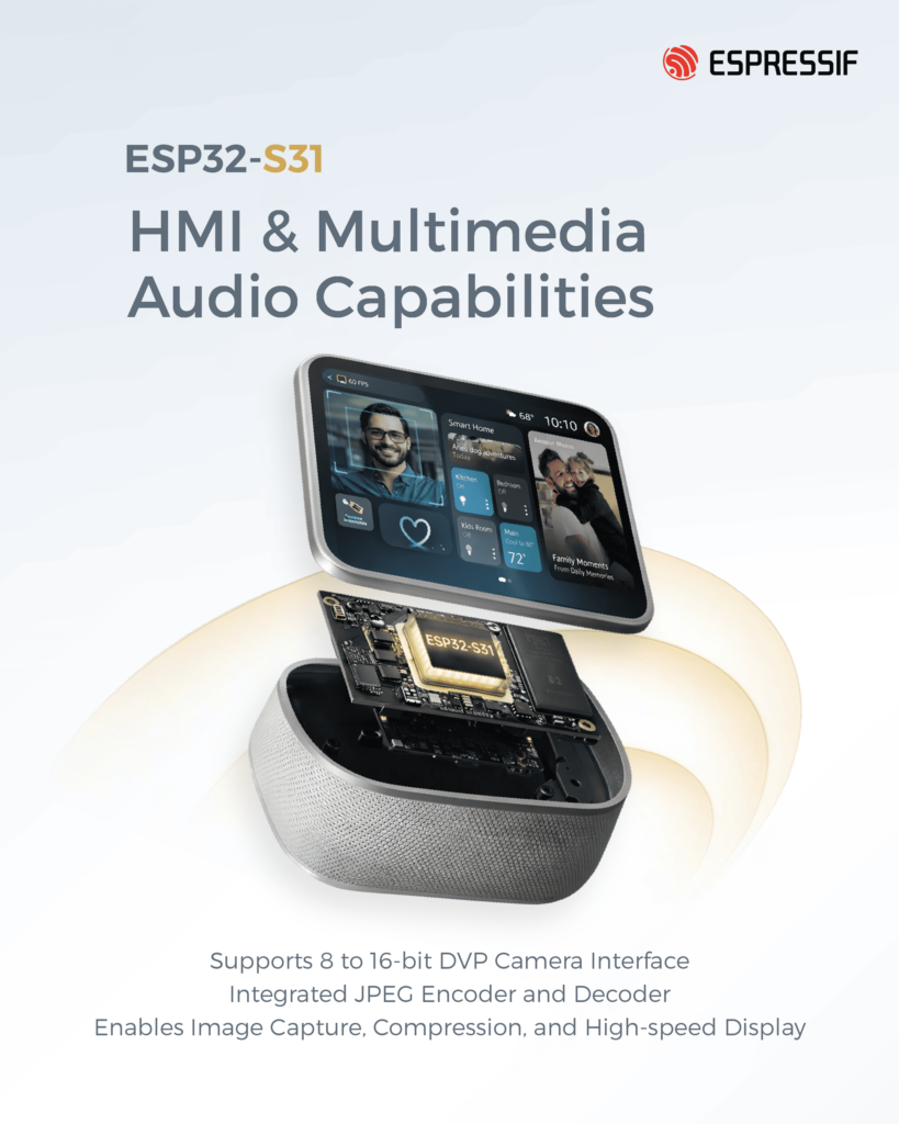 The other big angle is multimedia and HMI. Espressif says the ESP32-S31 includes a DVP camera interface, broad LCD support for parallel displays, hardware color space conversion, JPEG codec, PPA, 2D-DMA, and up to 14 capacitive touch channels. In plain English, this looks much more like a chip for smart displays, video doorbells, multimedia control panels, and voice-interface devices than a typical low-cost ESP board for simple automation tasks.